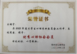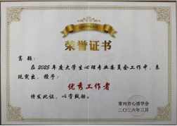 会议对2025年度高校心理健康教育先进集体与优秀个人进行了表彰,我校表现优异,获得多项荣誉。经学校择优推荐、理事会严格评审,我校心理健康教育中心葛颖老师荣获“2025年常州市大学生心理健康教育优秀工作者”称号;软件与大数据学院陈淼老师获评“2025年常州市高校优秀心理辅导员”;智能装备学院机器人241班荆婷同学、电子工程学院电子231班王鹏宇同学分别荣获“2025年常州市优秀心理委员”“2025年常州市优秀心理协会会员”称号。同时,我校凭借扎实的工作成效与体系化建设成果,成功获评“2025年常州市大学生心理健康教育先进集体”。