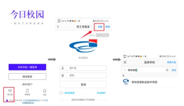 2.在登录界面下方,选择“学工号登录”,点击右上角“切换”按钮,搜索并选择“常州信息职业技术学院”;