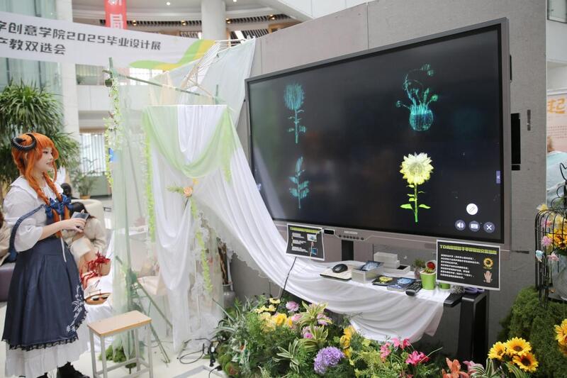 毕业展现场,同学们化身“第一讲解员”,为参会企业代表进行专场导览,用作品和创意丈量未来。粒子TD手控交互《植愈之境》以感性植物为主题;AIGC《常州online》城市宣传片融合九大标志性地标,结合动态叙事与交互体验,展现数字常州新形象;《“瓶”什么漂流》融合逐帧与MG技术、以创新叙事传递生态价值;《音缘起》以拟人化与数据可视化科普拼音演变,严守动漫全流程质量,深耕美术与节奏,融合AIGC探索,彰显专业育人成效与学术精神;《龙泉印泥》是基于虚幻引擎的严肃游戏,让用户沉浸式体验龙泉印泥从采藕、取丝到落印的全流程,助力常州非遗活态传承;《境里乾坤》面向职教抽象难讲训练高成本,构建含交互微实验、数字人讲解与视频的场景化数字教材,低风险提升理解实操能力;《古兽灵韵》把六只《山海经》异兽变成校园IP,用灵宠、表情包和文创,让传统文化在校园“活”起来;《栖泥·集趣》《画中花鸟志》以泥泥狗、花鸟画为核心,用交互装置重构空间叙事,融非遗科普于设计创意。