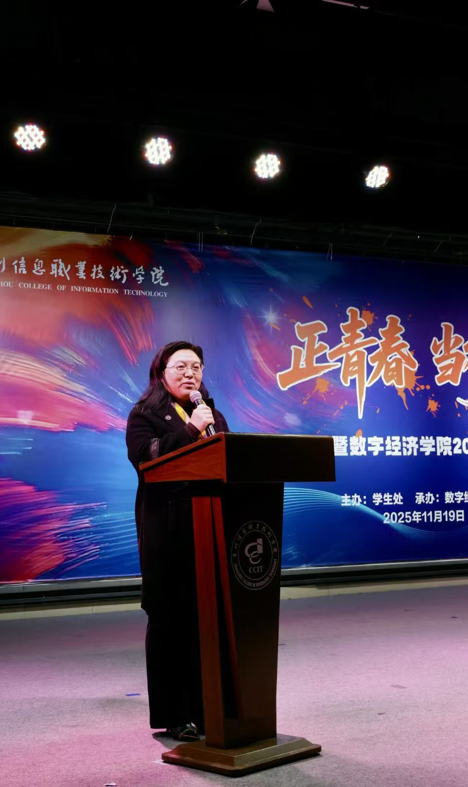 11月20日下午,数字经济学院在艺术教育中心举办了“正青春,当有为”国旗下讲话暨2025级新生成人礼。学院党总支书记杨华、副书记高成瑨,关工委委员,辅导员、家长代表以及全体大一新生共同见证了这场属于青春与成长的成人仪式。