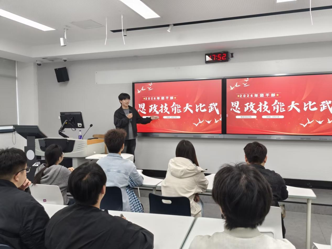 为深入学习贯彻习近平新时代中国特色社会主义思想,纵深推进思政教育与专业教育深度融合,切实锤炼团干部的思政素养、宣讲能力与履职本领,4月18日,智能装备学院团干部思政技能大比武选拔赛在教学楼 A204圆满举办。本次比赛共有15名团干部报名参赛,选手们以青春之声传递思想伟力,充分展现了学院青年学子坚定的理想信念与昂扬的精神风貌。