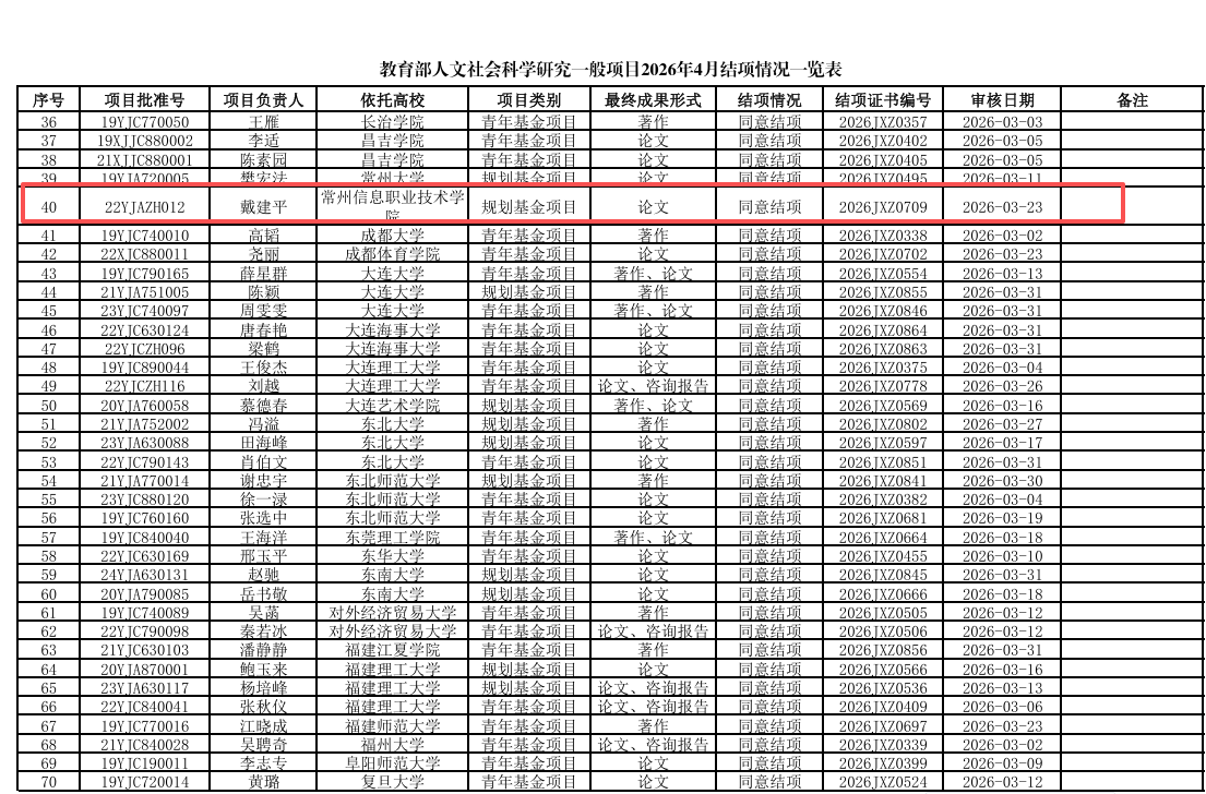 近日,教育部社会科学司发布《教育部人文社会科学研究一般项目2026年4月结项情况通报》,常州信息职业技术学院戴建平教授主持的教育部人文社会科学基金项目《工业互联网平台多边价值共创视角下制造企业供应链数字化转型研究》(22YJAZH012)顺利通过验收并结项。这是我院在数字经济、工业互联网与供应链管理领域取得的重要科研突破,进一步提升了学院服务地方产业数字化转型的学术影响力与社会服务能力。