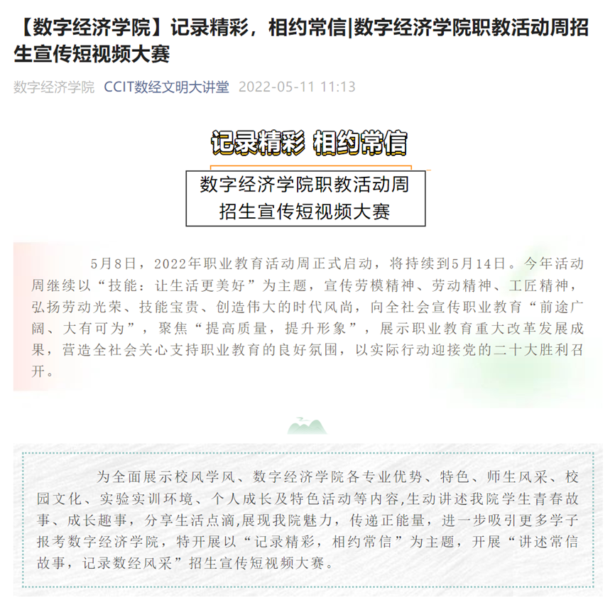 为深入学习贯彻习近平新时代中国特色社会主义思想,全面落实全国教育大会精神,坚持立德树人根本任务,激发我校师生爱校、兴校、荣校情怀,数字经济学院在认真总结以往工作经验和广泛征求意见的基础上,以“记录精彩相约常信”为主题,开展“讲述常信故事,记录数经风采”招生宣传短视频大赛。
