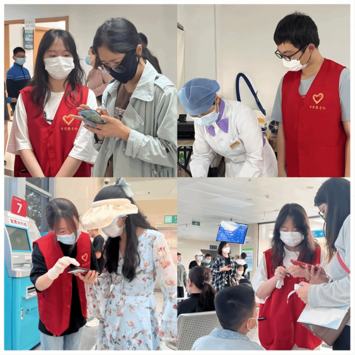 活动开始后,志愿者们在医院工作人员的带领下,满怀信心的走上服务岗位。统一穿着红马甲的志愿者,在门诊各区帮助患者指认相关科室的位置,协助患者使用自助挂号机器。面对每一位寻求帮助的患者,志愿者们热情努力的帮助病人使用自助挂号机,耐心引导他们找到相应的科室签到排队,力求以最佳的服务态度为患者带来更好的就医体验。