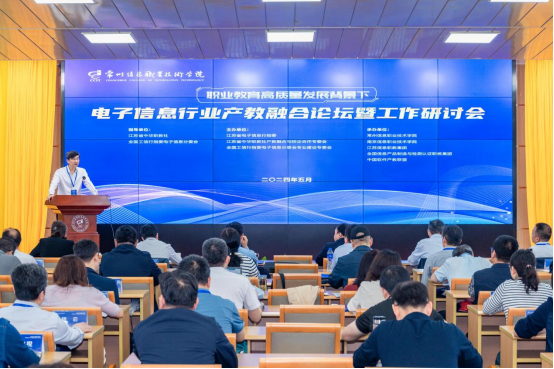 5月11日,我校召开职业教育高质量发展背景下电子信息行业产教融合论坛暨工作研讨会。江苏省委统战部二级巡视员、江苏省中华职业教育社秘书长倪南,省电子信息行指委副秘书长、省工信厅人事处二级调研员庄栋岭,常州市科教城管委会副主任庄三舵,省电子信息行指委副主任兼秘书长、南京信息职业技术学院校长田敏,江苏省中华职业教育社主任袁旭,省电子信息行指委副主任、常州工业职业技术学院党委书记席海涛,省电子信息行指委副主任、中通服咨询设计研究院有限公司副总经理郁建生,江苏电子信息职业学院校长张有东,江苏信息职业技术学院校长张瑜,扬州高等职业技术学校校长赵杰,苏州市电子信息技师学院校长苏建良,我校党委书记成建华,党委副书记、校长徐建俊等出席会议。省电子信息行指委代表,行业企业代表,电子与信息类职业院校负责人、骨干教师等100余名嘉宾参加会议。