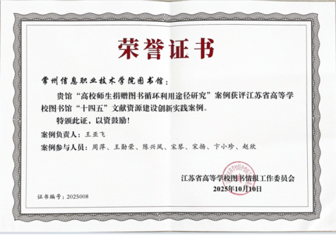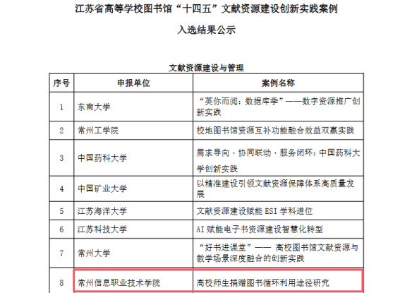 9月30日,江苏省高等学校图书馆“十四五”文献资源建设创新实践案例入选结果公示,我校图书馆申报的案例“高校师生捐赠图书循环利用途径研究”成功入选。全省共36个案例获表彰,其中高职院校案例8个。