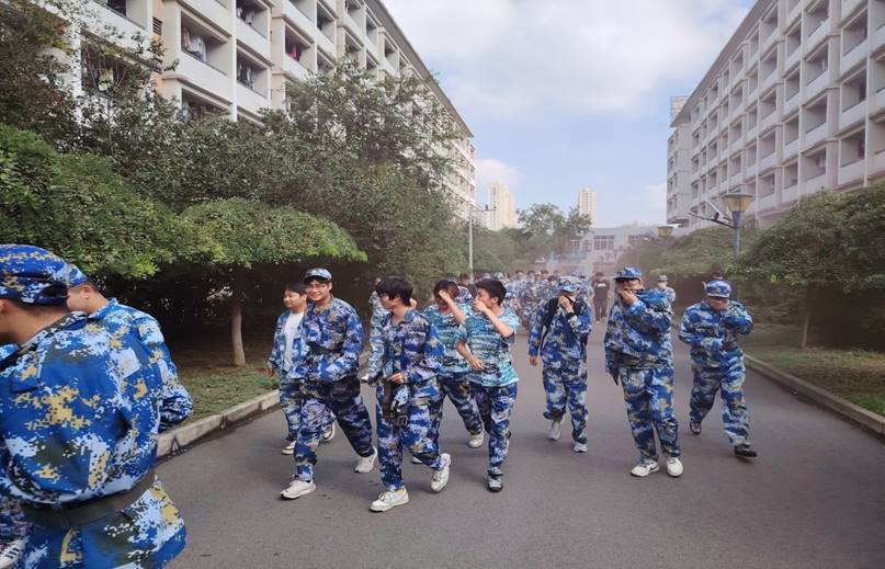 在应急逃生演练环节,除参与初起火扑救实操的人员外,2025级全体新生迅速响应、规范行动。听到疏散指令后,大家在楼宇观察员及工作人员引导下,用湿毛巾捂住口鼻,弯腰低姿快速通过“浓烟”区域,沿着指定疏散路线有序撤离至校园安全集结点,整个过程紧张有序、衔接顺畅,充分展现了良好的应急反应能力。