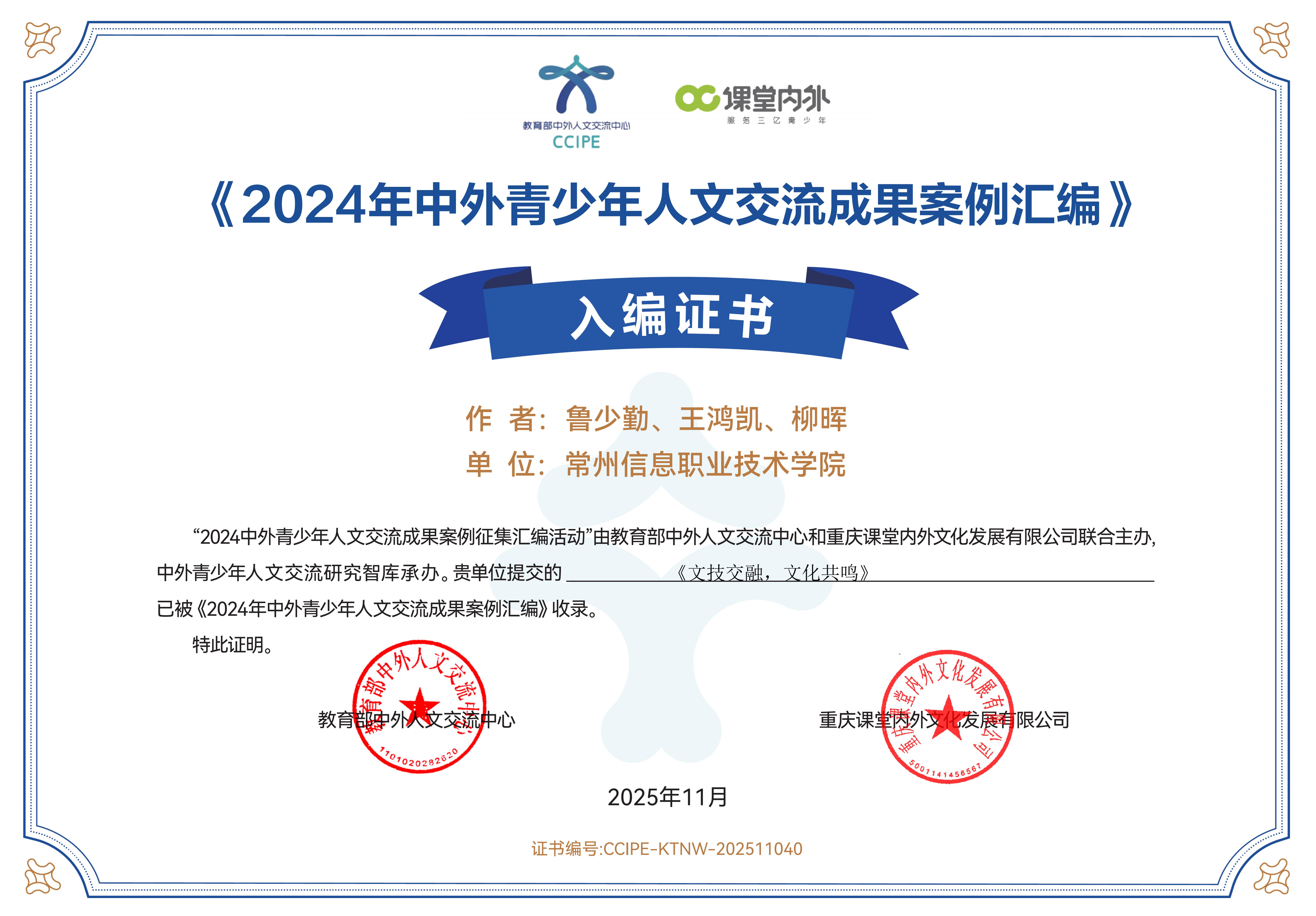 近日,由教育部中外人文交流中心与重庆课堂内外文化发展有限公司联合主办、中外青少年人文交流研究智库承办的“2024中外青少年人文交流成果案例征集汇编活动”结果正式公布。我校报送的案例《文技交融,文化共鸣》(作者:鲁少勤、王鸿凯、柳晖)成功入选并收录于《2024年中外青少年人文交流成果案例汇编》。