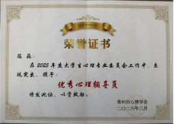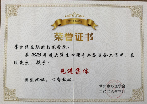 会议对2025年度高校心理健康教育先进集体与优秀个人进行了表彰,我校表现优异,获得多项荣誉。经学校择优推荐、理事会严格评审,我校心理健康教育中心葛颖老师荣获“2025年常州市大学生心理健康教育优秀工作者”称号;软件与大数据学院陈淼老师获评“2025年常州市高校优秀心理辅导员”;智能装备学院机器人241班荆婷同学、电子工程学院电子231班王鹏宇同学分别荣获“2025年常州市优秀心理委员”“2025年常州市优秀心理协会会员”称号。同时,我校凭借扎实的工作成效与体系化建设成果,成功获评“2025年常州市大学生心理健康教育先进集体”。