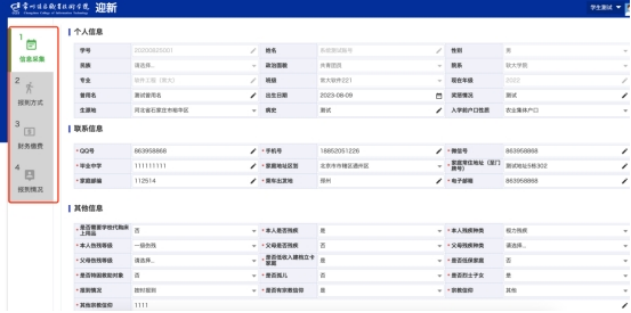 2.3根据界面上的要求完成“信息采集”并提交、填写“报到方式”;其中,学生可以自行查询“学费缴纳情况”及“报到情况”。
