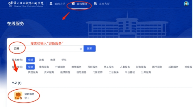 2.2“在线服务”导航处搜索“迎新服务”,点击即可进入;
