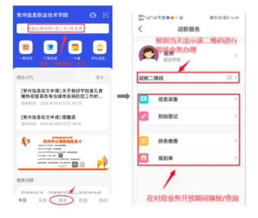 在今日校园APP首页,可直接搜索框搜索“迎新服务”应用,或者点击底栏的“服务”查询应用,即可进入迎新业务办理页面,完成/查看相关报到手续;