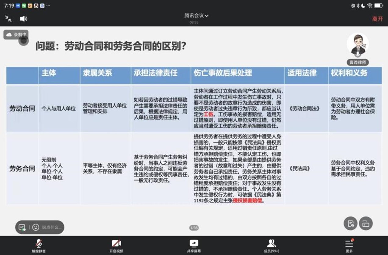 为聚焦家校协同育人目标,切实提升家长法治素养、筑牢家校共育防线,9月26日,数字创意学院联合智能装备学院通过腾讯会议平台举办“青春与法同行”法制宣传周线上家长会。本次活动特邀江苏华东律师事务所曹晔律师,围绕《劳动法》开展专题普法,吸引两院学生家长齐聚云端,共同解锁“职场第一堂法律必修课”。