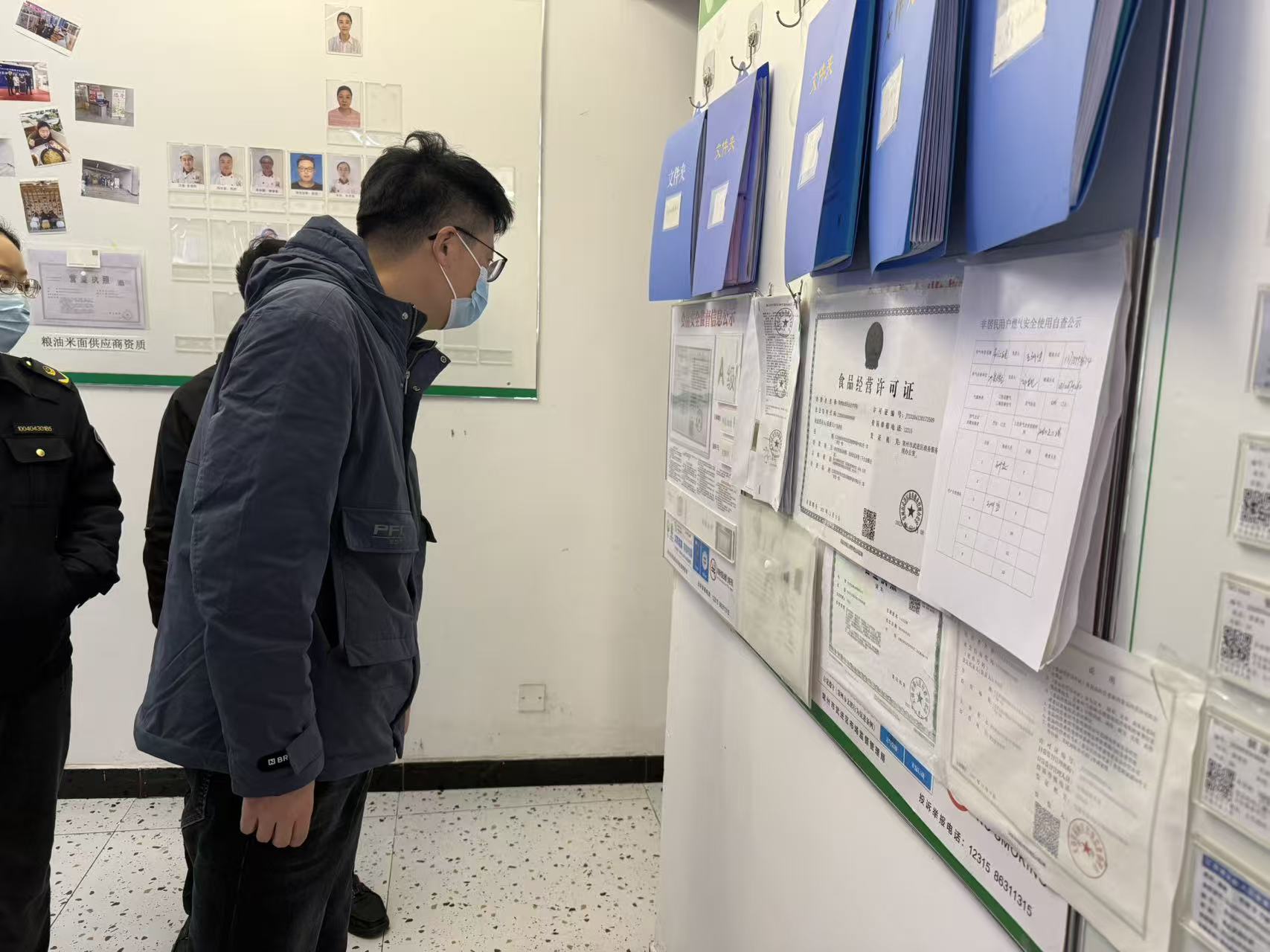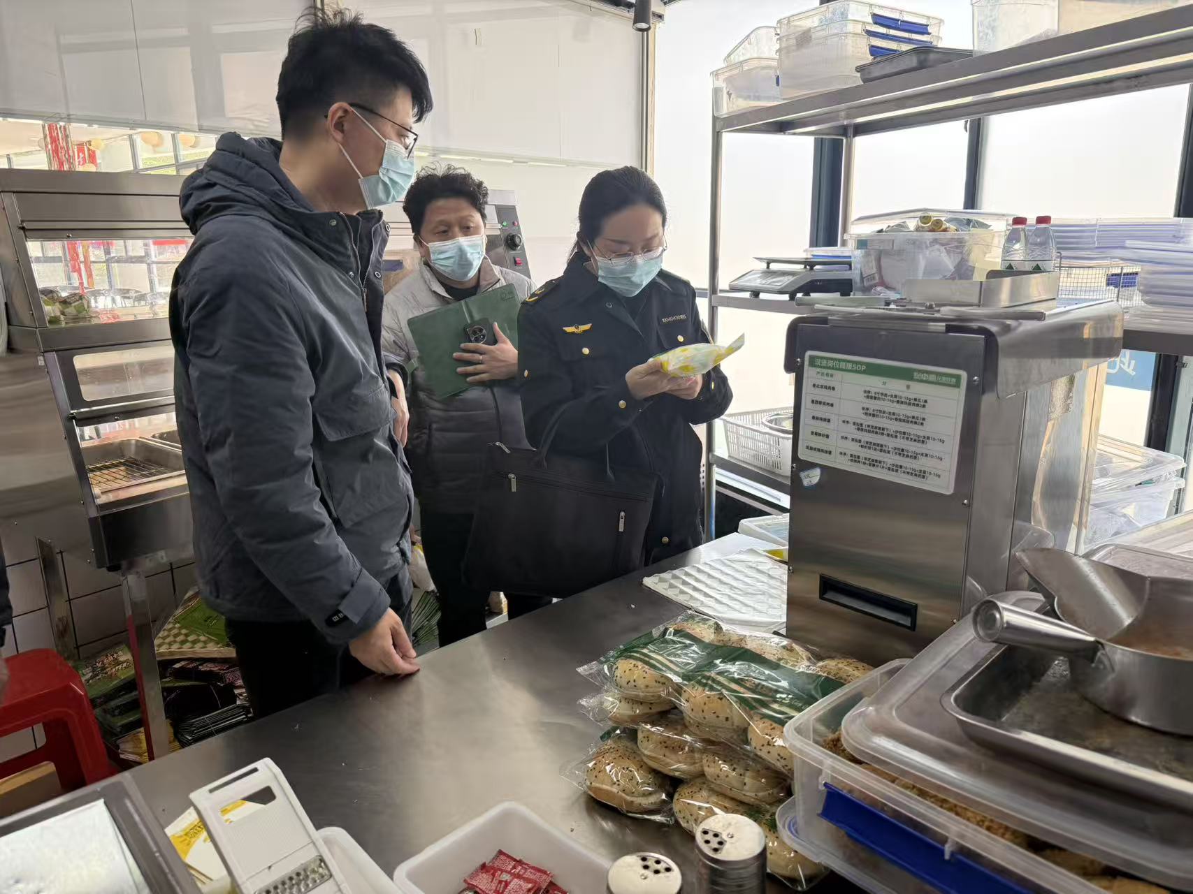 检查组深入食堂操作间、备餐间、原料库房及用餐区等关键区域,采取“看现场、查台账、问细节”的方式,围绕资质证照、食材溯源、加工规范、餐具消毒及留样管理等核心环节进行了全面细致的核查,仔细翻阅食品原料采购索证索票、进货查验记录及从业人员健康档案,对食品留样、餐具清洗消毒、防蝇防鼠设施等进行逐一核验。