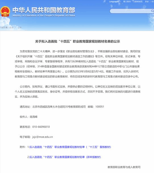 近日,教育部发布了《关于拟入选首批“十四五”职业教育国家规划教材名单的公示》。公示显示共有7262种教材拟入选首批“十四五”职业教育国家规划教材。我校3部首届全国教材建设奖职业教育类获奖教材、19部“十三五”职业教育国家规划教材及6部新申报教材入选,入选教材总量居江苏省高职院校第4位。(文/吴睿 审/朱敏、吴昊、张煜)